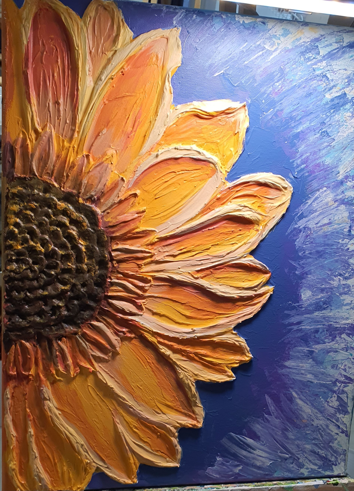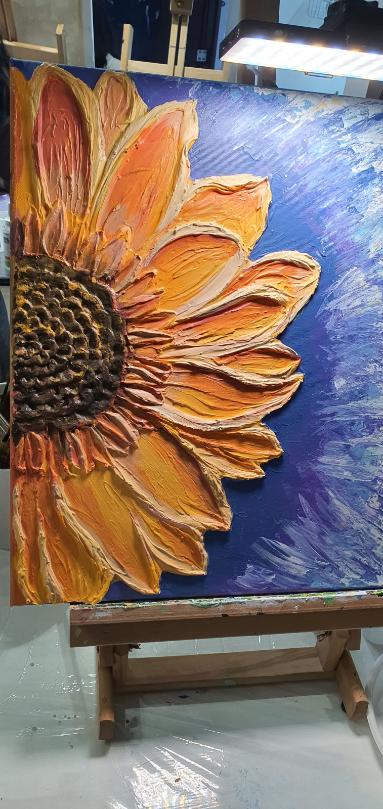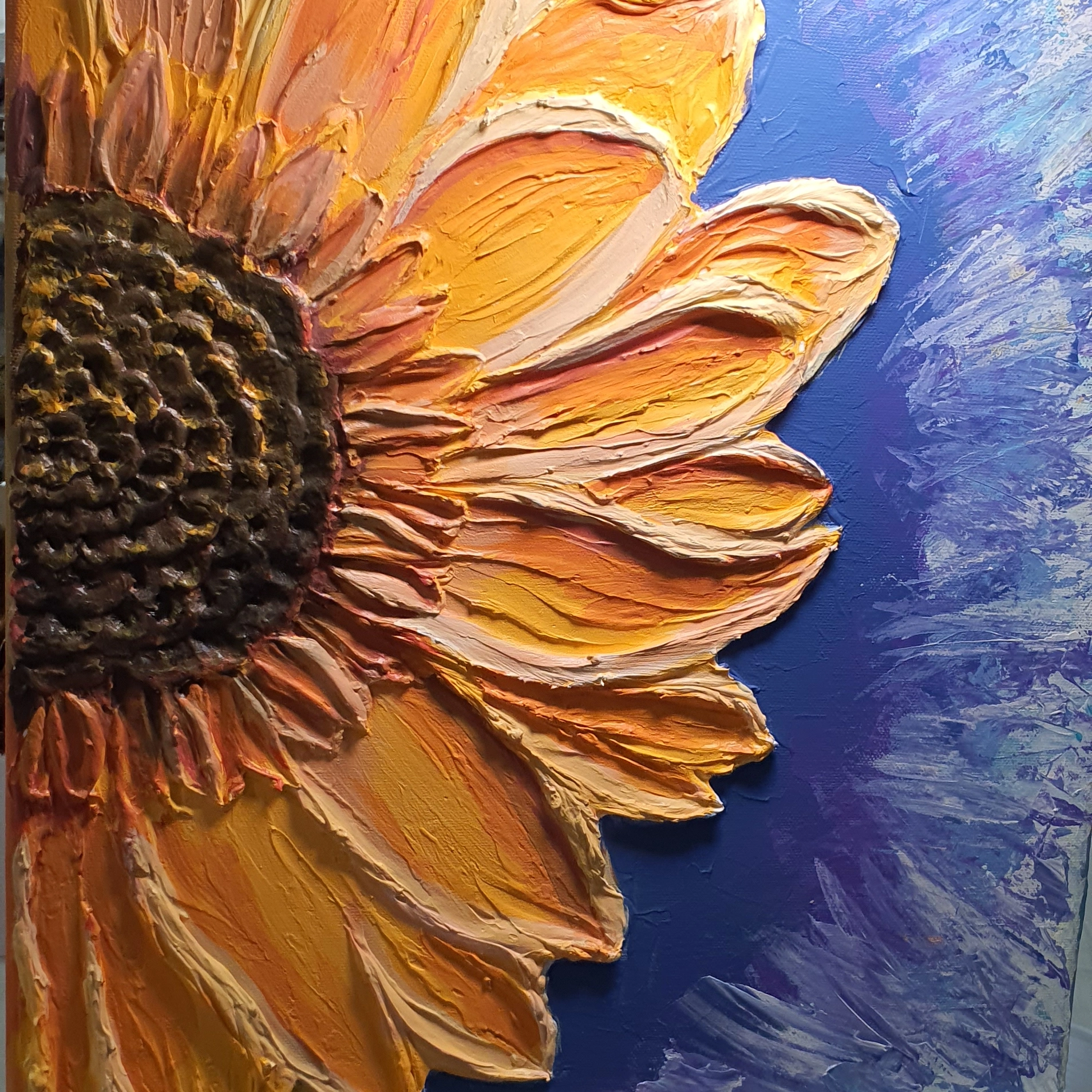 „Petale din soare” este un dialog între lumina soarelui și culoare. Floarea-soarelui se desfășoară cu forță și delicatețe către cer. Textura bogată face ca fiecare petală să pară vie și în mișcare. Pe fundal, cerul se deschide în nuanțe vibrante, de mov și indigo. Tabloul transmite lumină, optimism și bucuria simplă de a trăi.